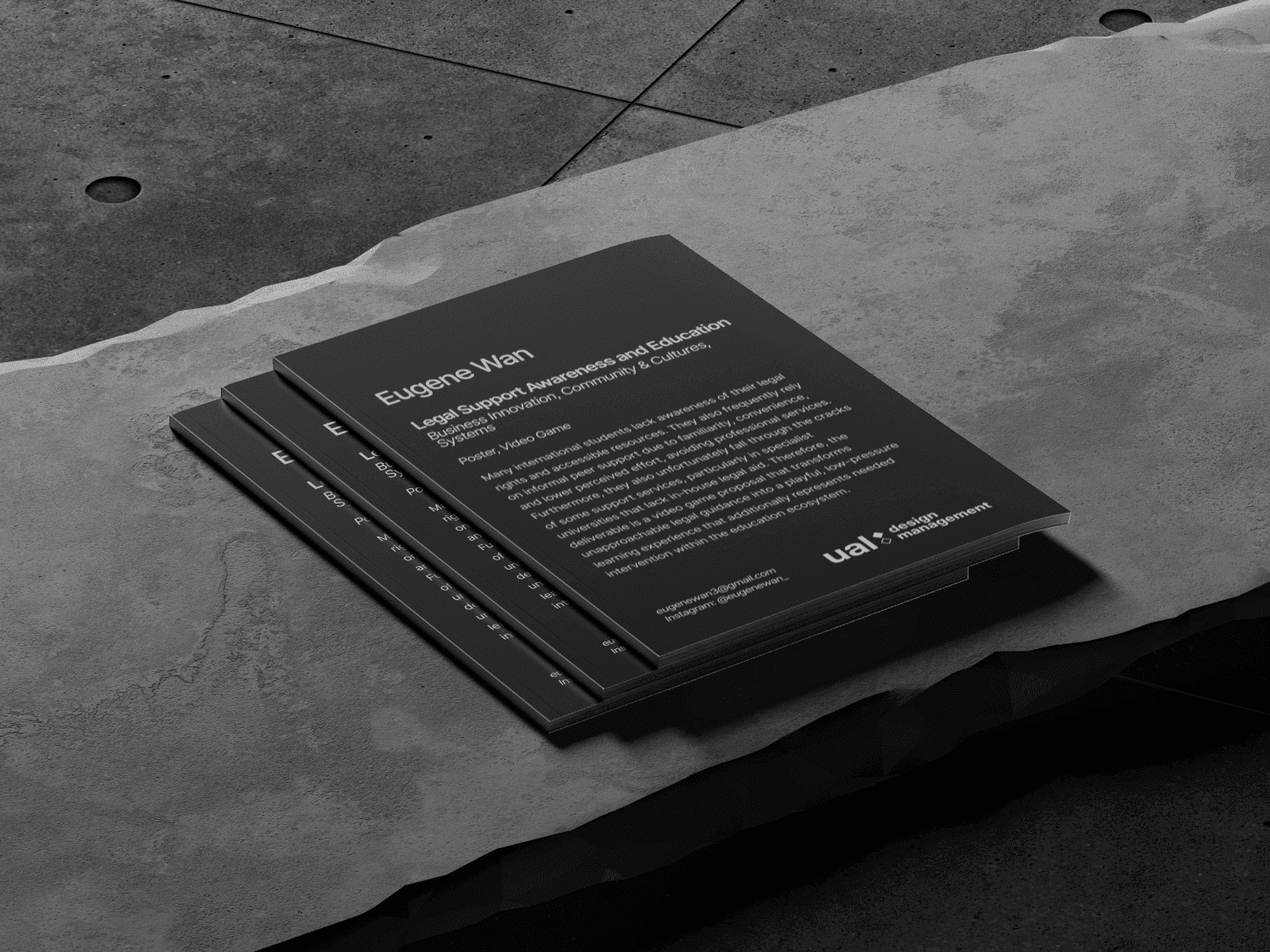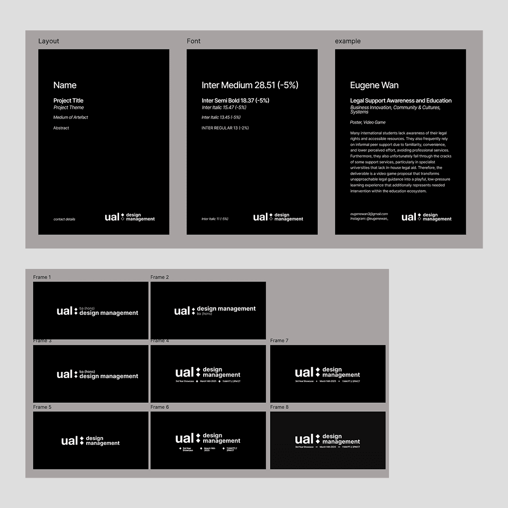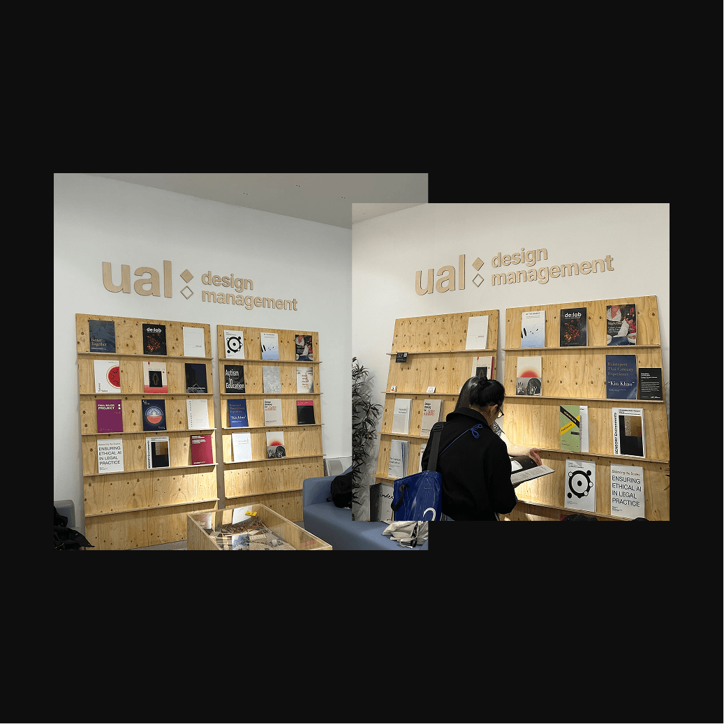 I was tasked with creating visual assets for the BA (Hons) Design Management course at UAL as part of the undergraduate showcase. These assets included a logo for use across digital promotional materials, as well as custom-designed placards to accompany and present students’ work. The logo design was heavily inspired by the university’s iconic branding, incorporating its simplicity and recognisable identity. In addition, the design references the Double Diamond framework, the cornerstone of design processes and a core principle demonstrated throughout the exhibition and course itself.